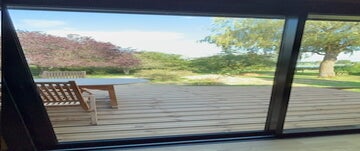 La belle baie vitrée apporte de la lumière et offre une vue spectaculaire sur l’étang.